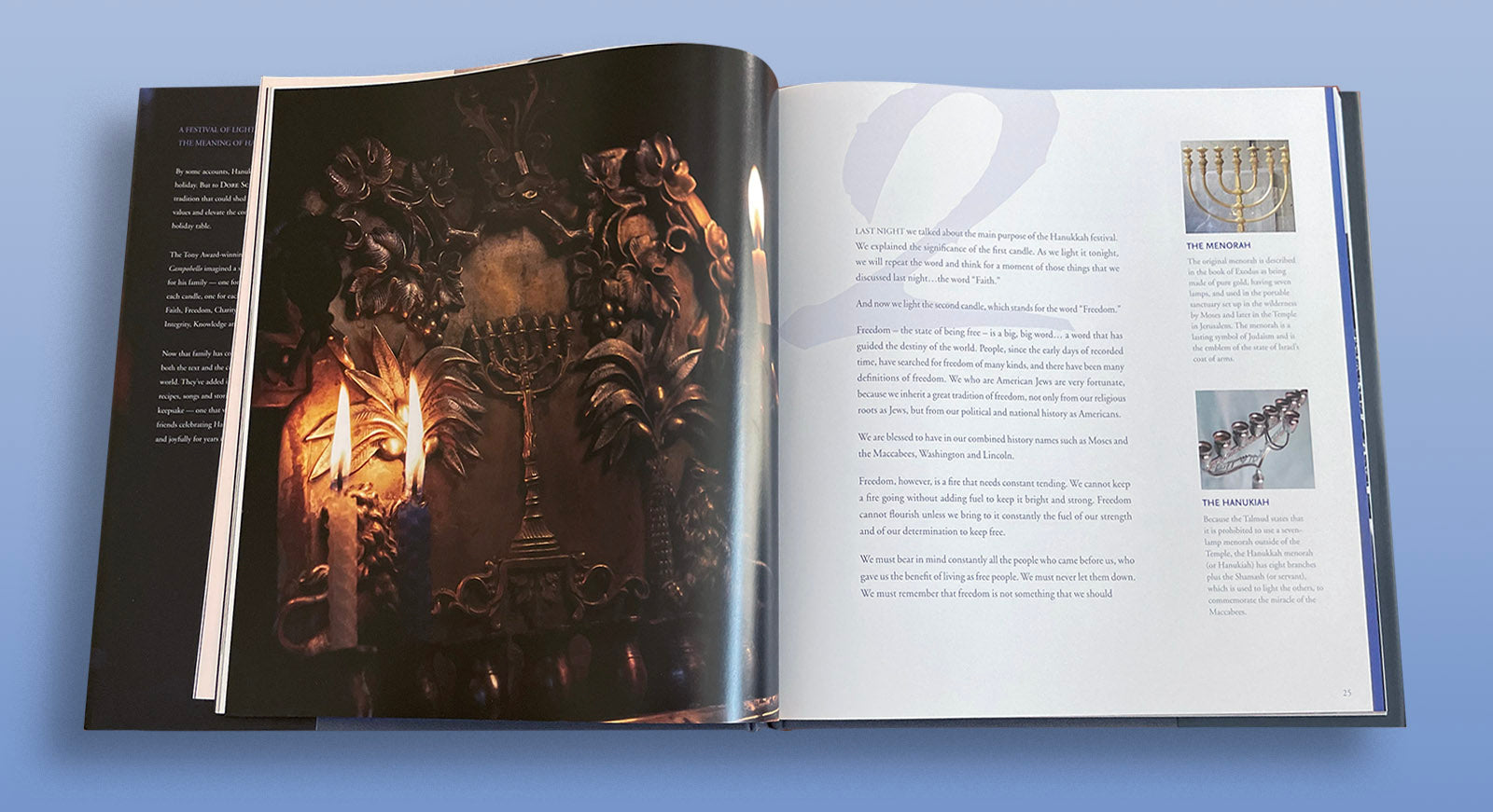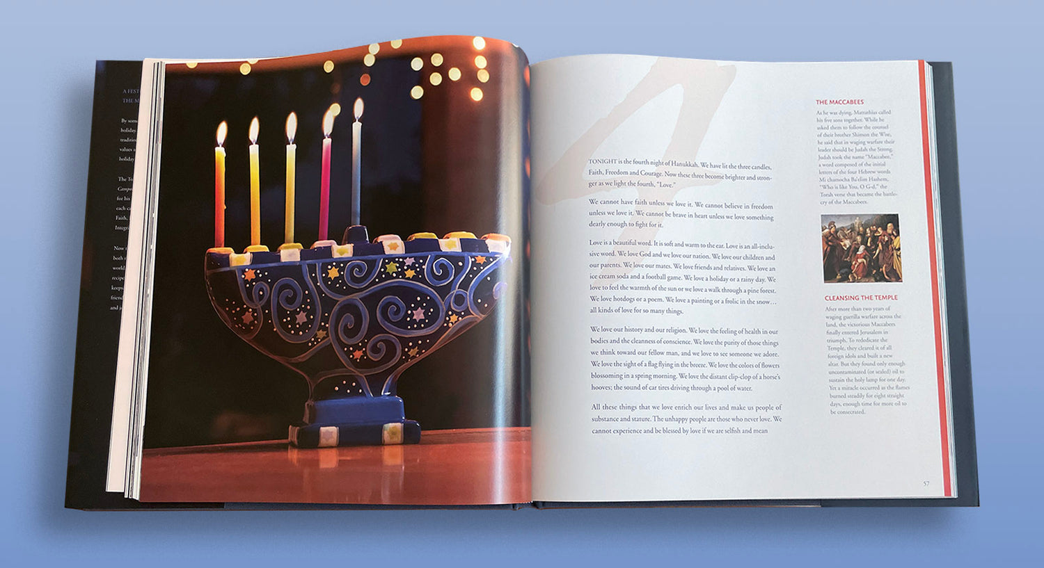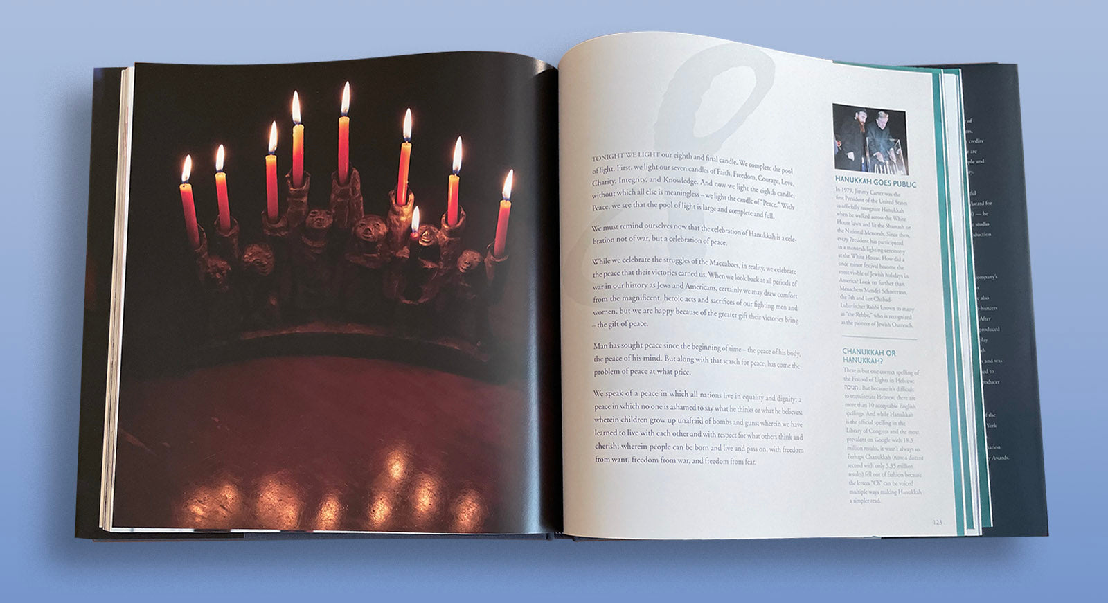 A Festival of Light, is a 144-page, 11” x 11,” hardcover pictorial coffee table book that celebrates Hanukkah and eight core human values: Faith, Freedom, Courage, Love, Charity, Integrity, Knowledge and Peace.